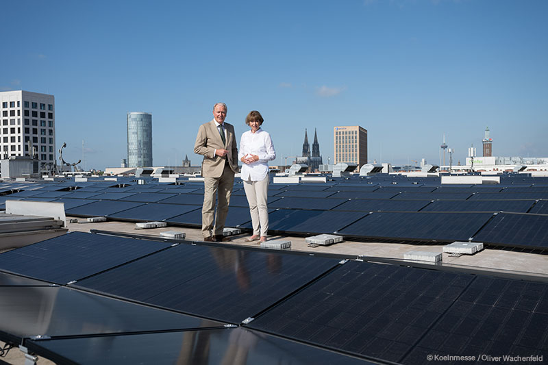 Auf dem neu eröffneten Confex der Koelnmesse verwandeln 500 Photovoltaik-Module Sonnenlicht in grünen Strom. Jetzt kommt auf dem Dach der Halle 11 die größte innerstädtische Photovoltaik-Anlage Kölns hinzu. Mit 4.800 Modulen verspricht sie einen jährlichen Ertrag von rund zwei Millionen Kilowattstunden. „Die Inbetriebnahme dieser großen Photovoltaik-Anlage ist ein bedeutender Schritt auf unserem Weg zur nachhaltigen Energieversorgung“, sagt Gerald Böse, CEO der Koelnmesse GmbH. „Und wir sind noch nicht fertig! Es wurden bereits weitere 2.100 Solarmodule geliefert und auf dem Dach unserer Halle 1 installiert.“