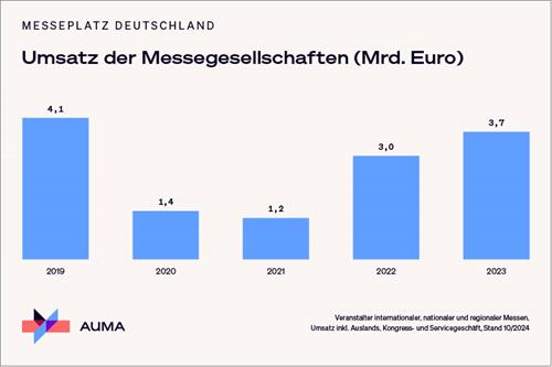 Die meisten Veranstalter in Deutschland berichten von positiven Geschäften in diesem Jahr. Der AUMA rechnet daher mit einem Anstieg des Jahresumsatzes auf knapp vier Milliarden Euro. Damit nähert sich die deutsche Messewirtschaft dem Umsatzniveau wie vor der Corona-Pandemie weiter an.